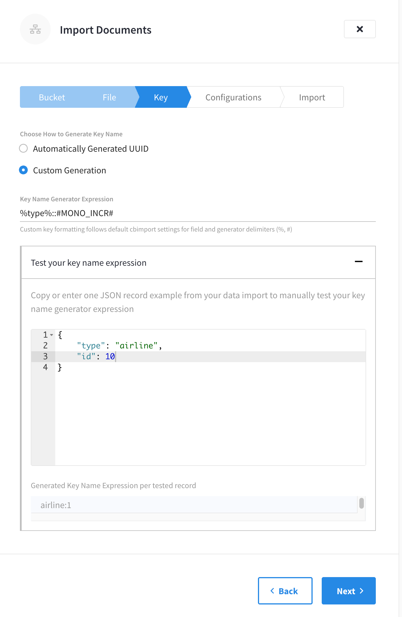 After adding your collection mapping, you must add your key generator. Import offers many options for custom key generation. By default, it will automatically generate UUIDs for each JSON document in your file, but you have the option to generate custom keys.